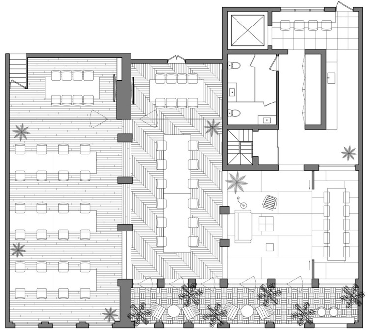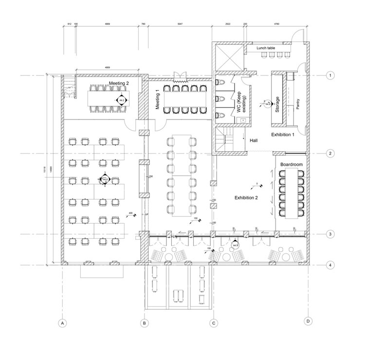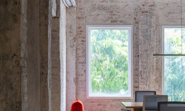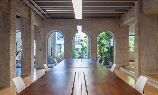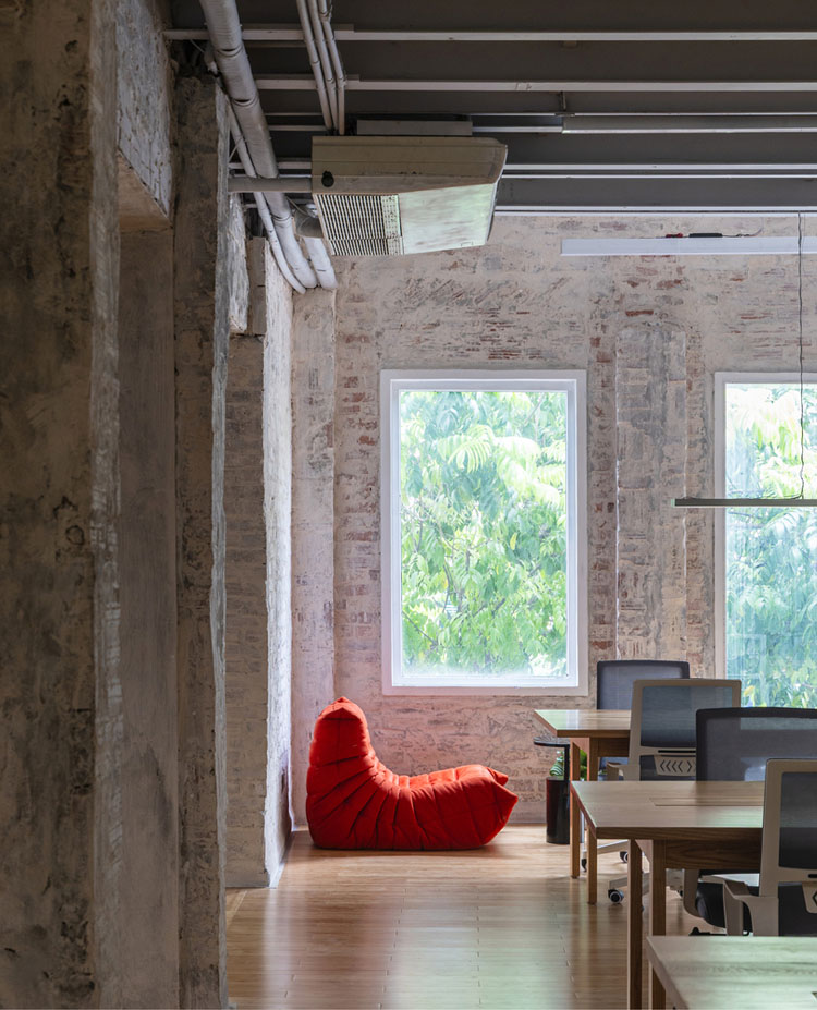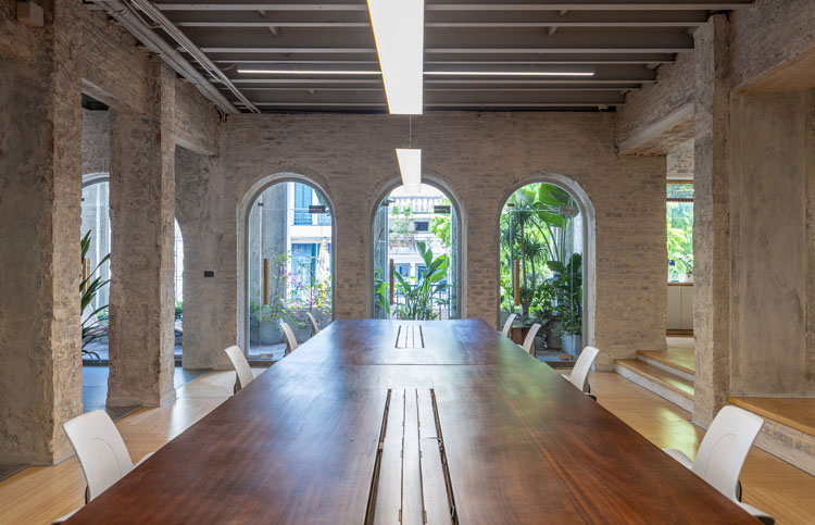 Các phòng họp và khu vực chức năng được ngăn chia bằng hệ vách kính trong suốt, cho phép tầm nhìn xuyên suốt và phô bày vẻ đẹp của kết cấu gạch cũ.